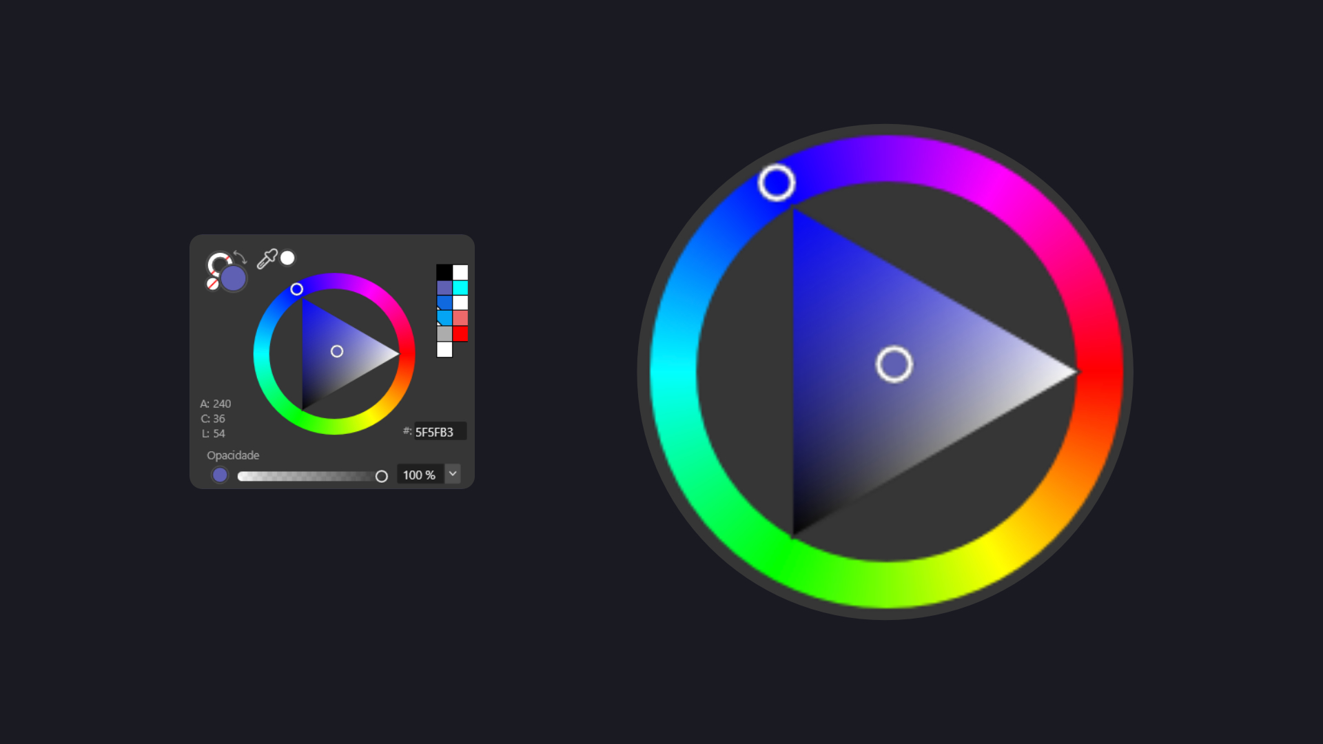 Na imagem acima você pode ver a ferramenta de seleção de cores do aplicativo de design Affinity. Ele funciona através de dois controles deslizantes: um deles posicionado sobre uma Roda de Cores (Matiz), e o outro sobre um triangulo (Saturação e Luminosidade).