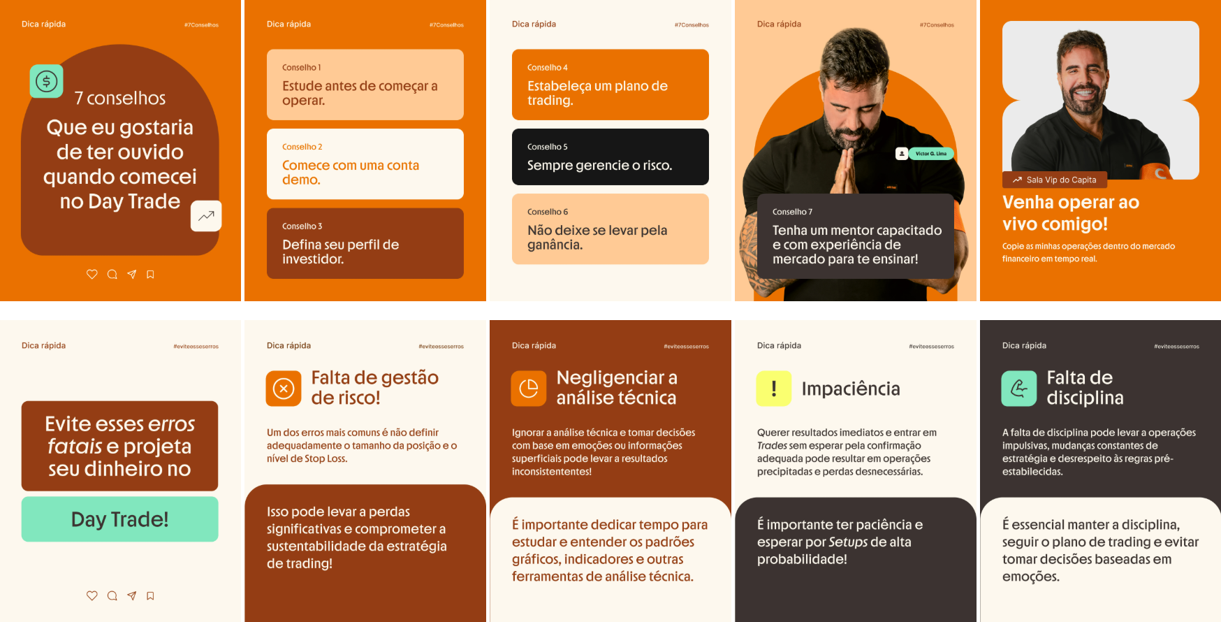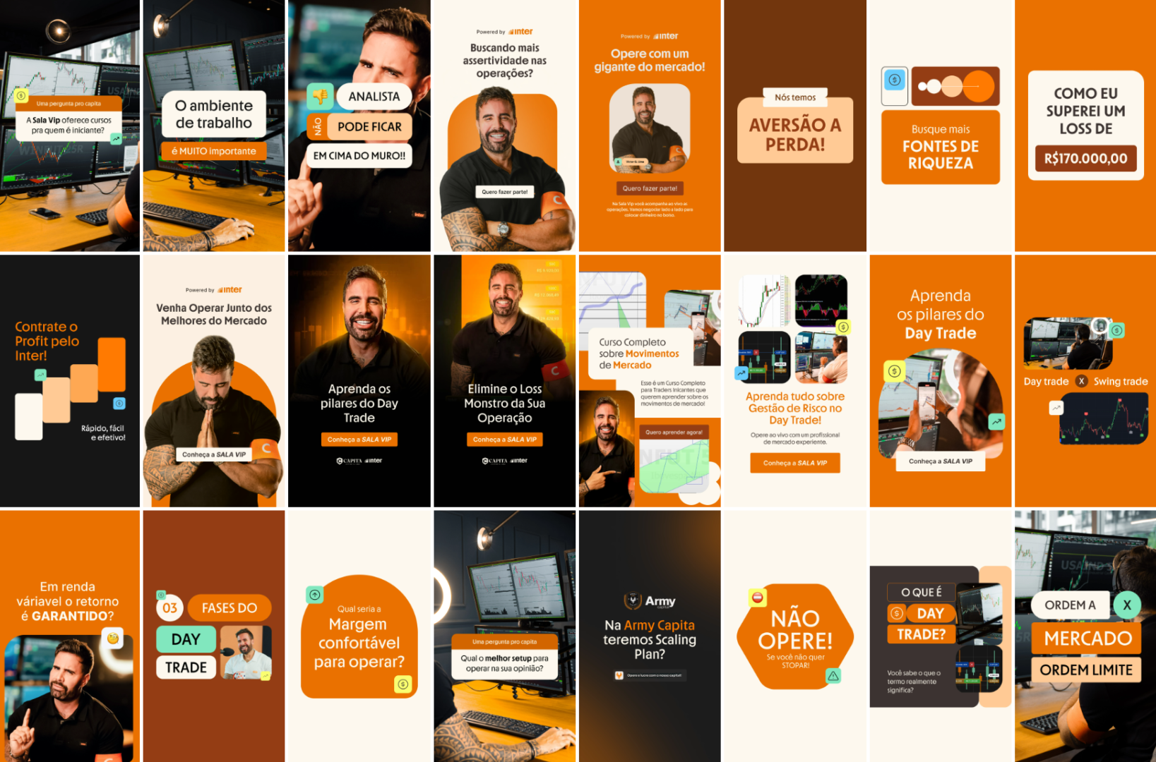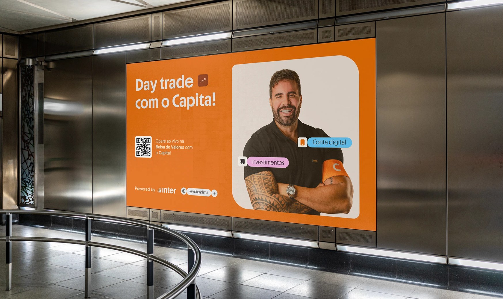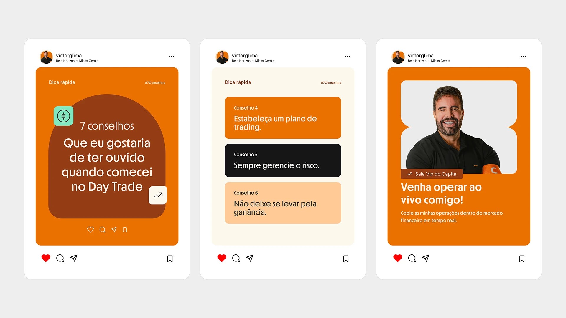 Na sequência de imagens acima, mesmo em mídias distintas como outdoors e redes sociais, o Banco Inter tem uma identidade visual apoiada principalmente no uso da cor laranja. Embora outras cores como verde, amarelo, preto e até azul estejam presentes, o laranja é a cor dominante e se repete por todas as peças.