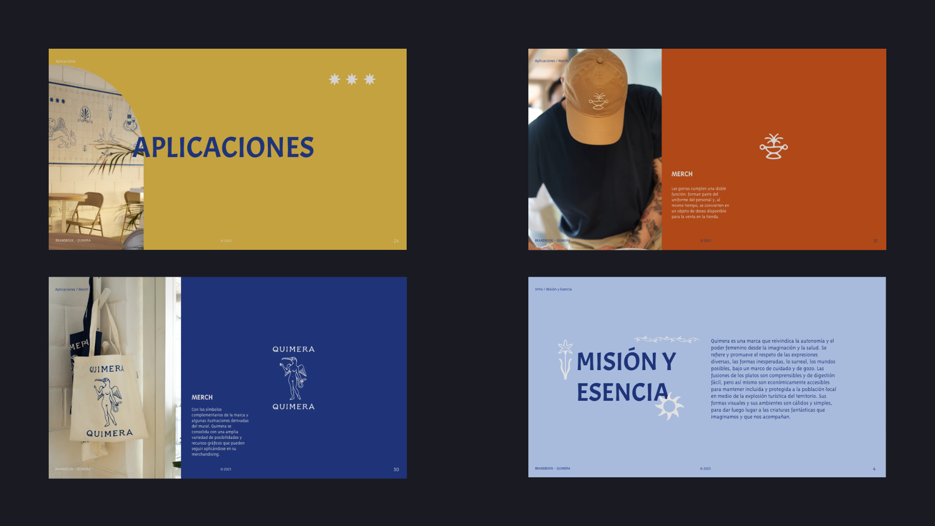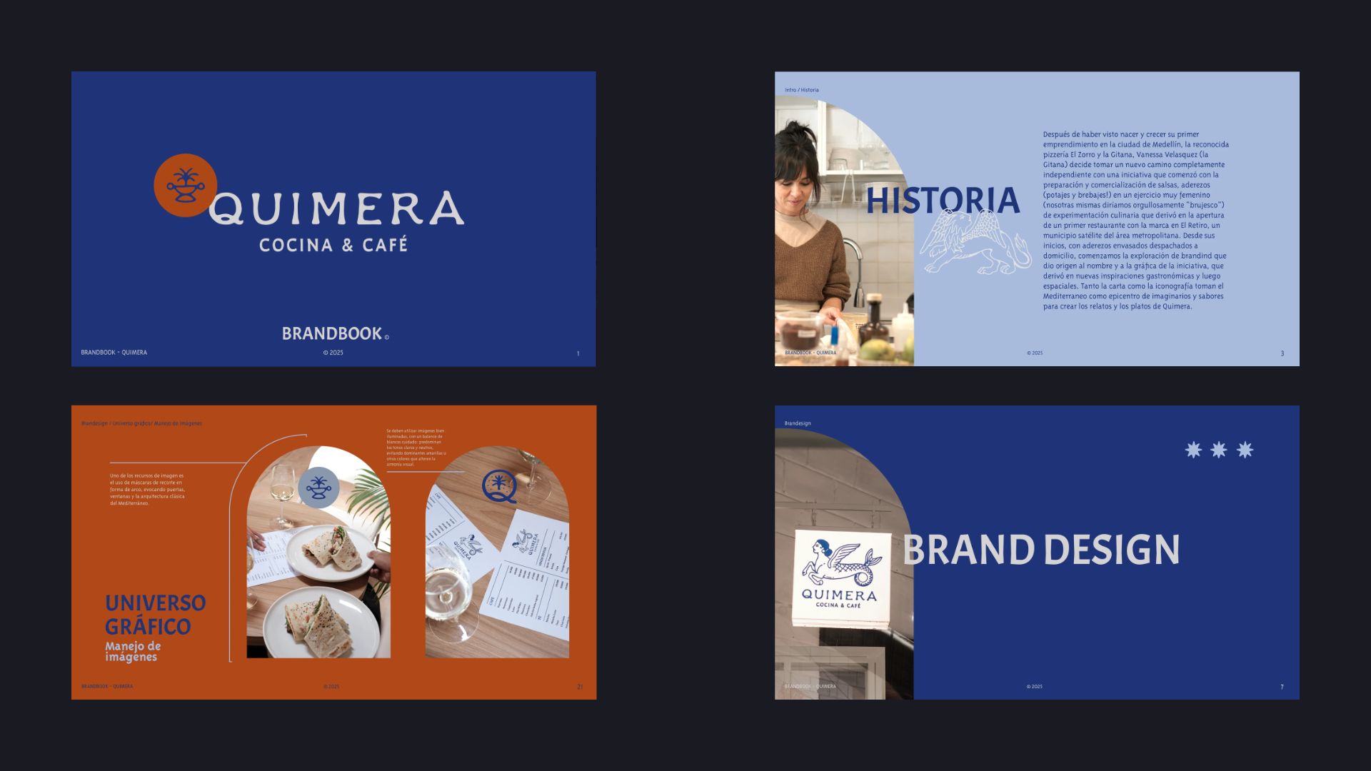 O projeto abaixo é um Brandbook (livro de marca) desenvolvido por Laura Valde para a Quimera Cocina e Café. Você consegue identificar os três exemplos de repetição mencionados anteriormente?